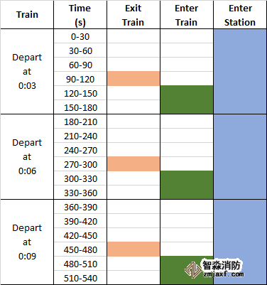 在描述地鐵模型之前,用一個小的概念模型來演示這個方法是很有用的。圖2顯示火車時刻表。火車每隔3分鐘開出一班,卸貨30秒,裝貨60秒。乘客以100%的速度連續(xù)進入車站12次/分鐘并以以下流速離開列車1.2秒/秒30秒。