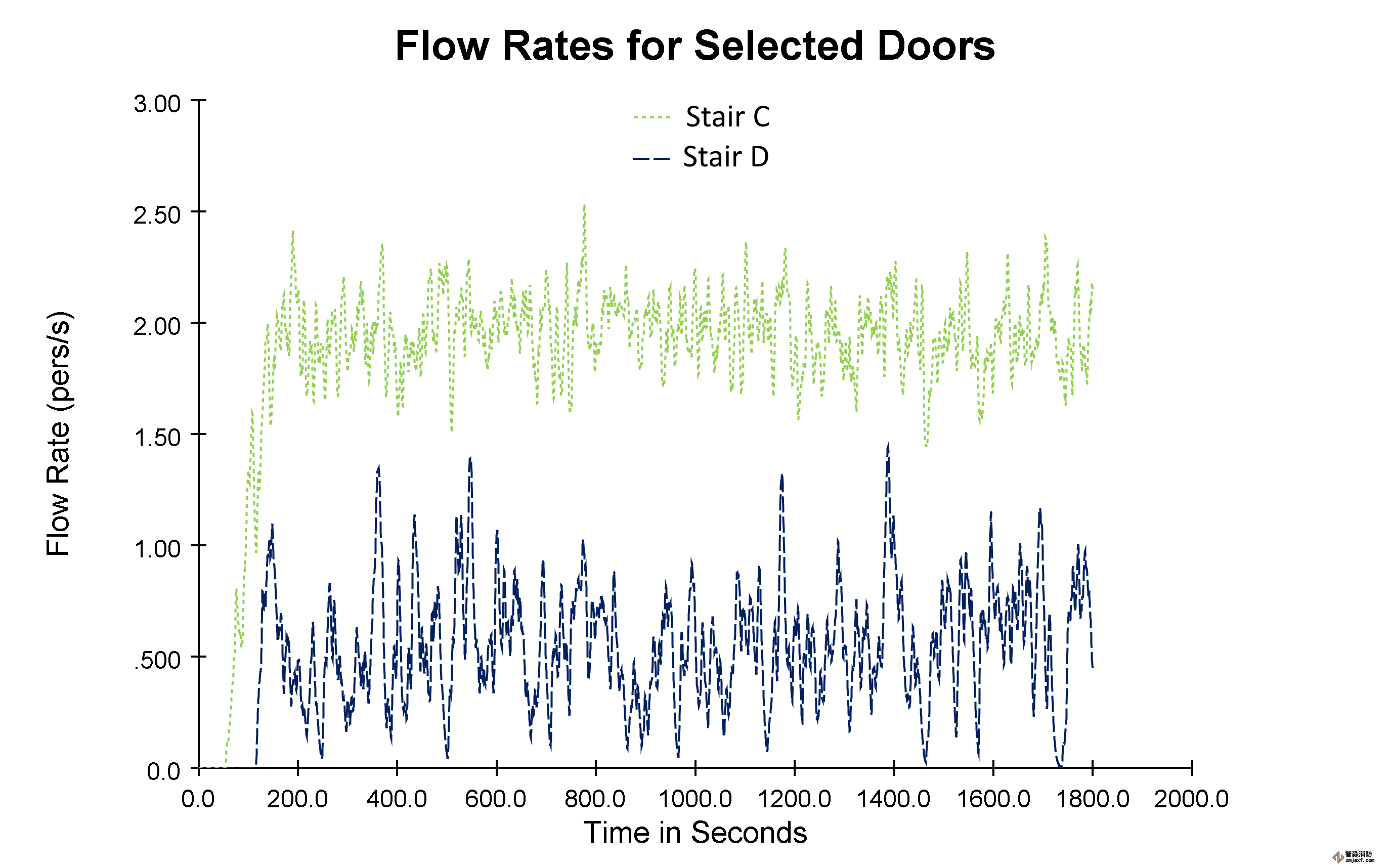 這在樓梯的流速圖中得到證實。圖13顯示了樓梯A和B的上升氣流,同時圖14顯示了樓梯C和D的向下流量。為了比較,這些樓梯的SFPE流量峰值為2.4次/秒。樓梯A和B的向上流動是循環(huán)的,反映了列車的到達。這些樓梯上的峰值流速大約是1次/秒。由于乘客的穩(wěn)定到達,C和D樓梯的向下流動更加穩(wěn)定。樓梯C顯示相對恒定的流速約為2次/秒。