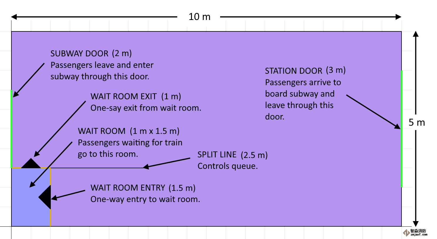 圖3顯示了幾何圖形。右邊的門是車站門。這個門有一個附加的來源,將新的乘客插入模型,車站門也是離開車站的乘客的出口。這等候室利用它的門和分割線是一種利用當(dāng)前的Pathfinder能力管理隊列的方法。將登上火車的乘客有一個行為這告訴他們?nèi)サ群蚴遥缓蟮降罔F門口下車。除了作為出口之外地鐵門有一個附加的來源,插入乘客然后前往車站門退出。事件的時間如所示圖2連續(xù)不斷的乘客進入車站排隊時,地鐵列車會讓乘客下車30秒鐘,然后候車室的出口門會打開60秒鐘,乘客就會登上列車。然后循環(huán)重復(fù)。