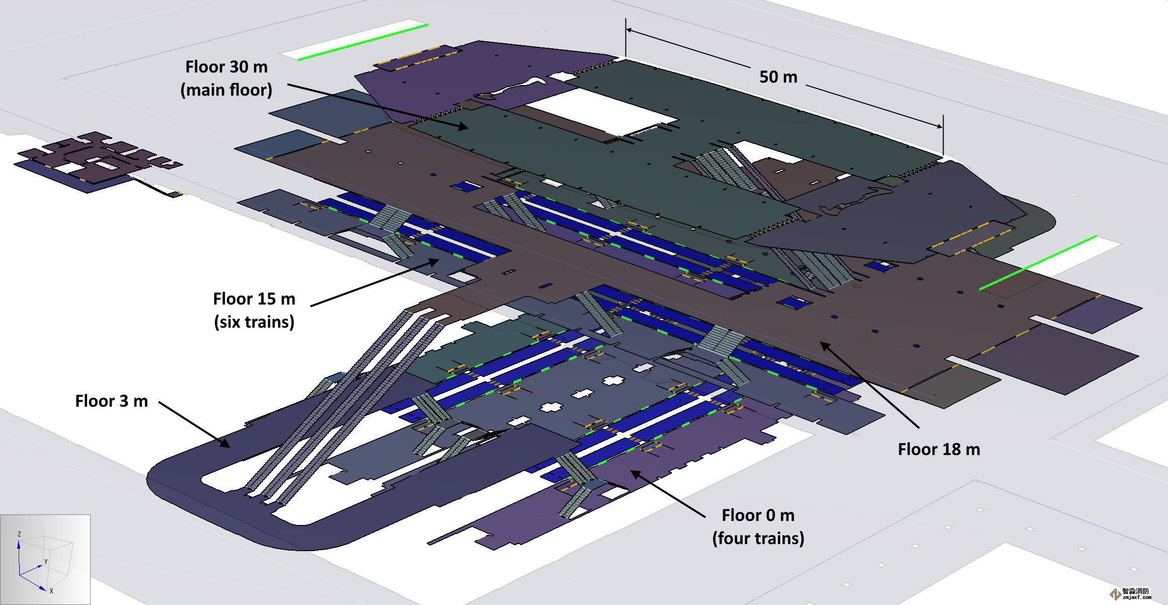- 樓層3米–該層的一側(cè)聚集從0米層離開的乘客,并通過自動扶梯將他們運送到18米層。3米層的另一側(cè)供從18米層下降到0米層的乘客使用,以登上列車。