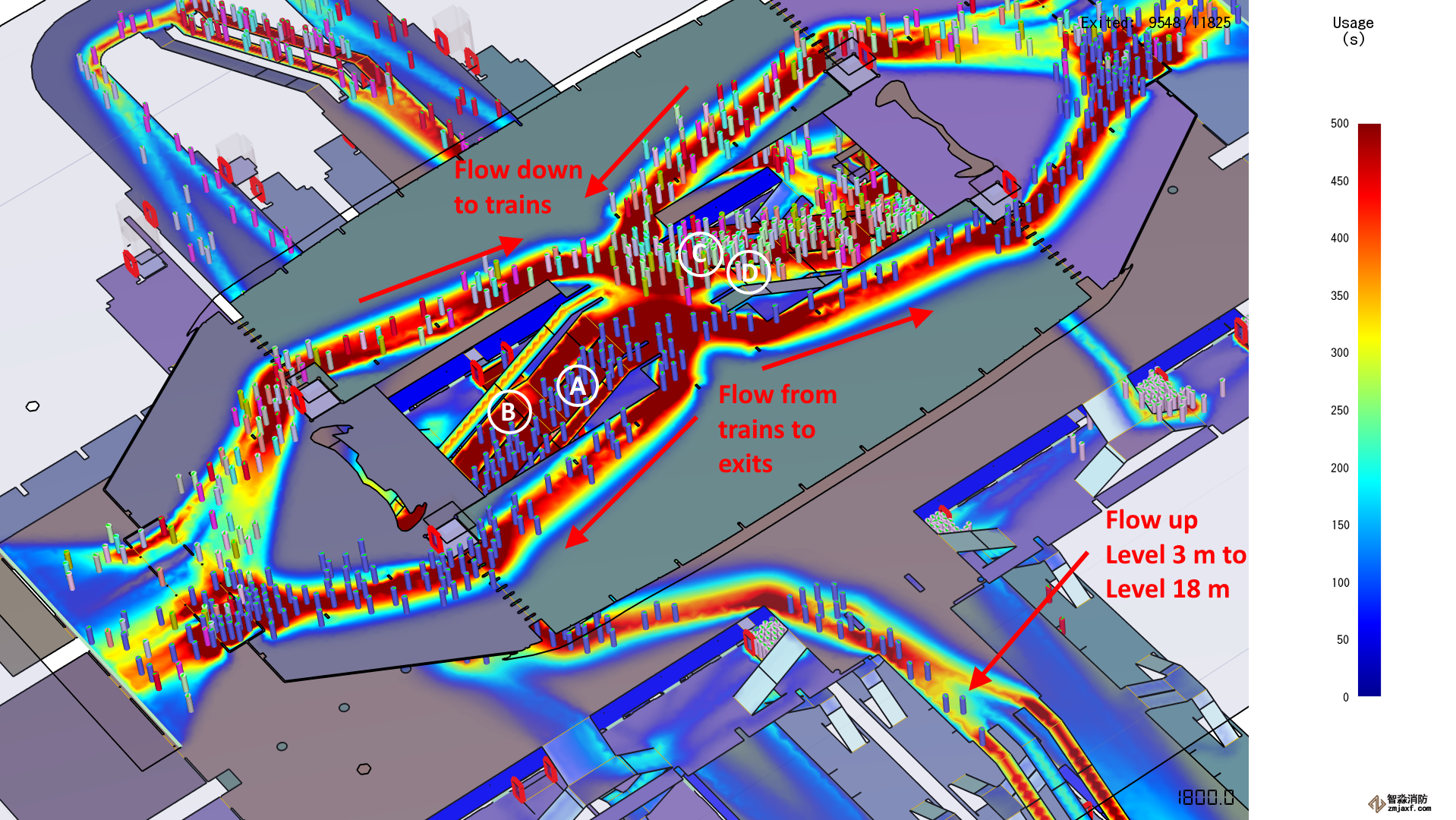讓我們更詳細(xì)地看一下樓梯A和B,它們管理從列車向上的流動,以及樓梯C和D,它們管理向下的流動以登上列車。等高線顯示,A樓梯比B樓梯使用得多。原因是A樓梯鄰近列車從3層向上的氣流,所以更多的乘客使用更近的樓梯。但是因為從15層到18層的兩側(cè)都有向上的水流,所以樓梯B也有很大的用途。向下的水流都全數(shù)從靠近樓梯C的一側(cè)進入,所以它比樓梯d使用得多