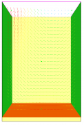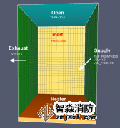 下面是一個示例,可以練習上述大部分選項。右側有一個供氣口,溫度為50.0 C。在底部,加熱器500 C通過對流和輻射提供熱量。在左側,部分空氣被排出,表面溫度值為20 C。頂部是OPEN,正面和背面是INERT。 速度矢量如圖 3所示。