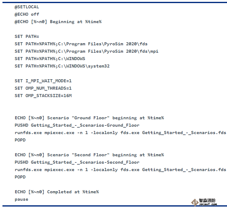 批處理腳本的前 11 行為 FDS 和 MPI 設(shè)置了一些環(huán)境變量,并在運(yùn)行時(shí)將一些輸出打印到 shell 窗口。