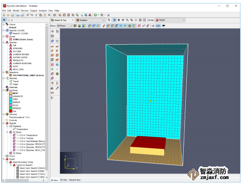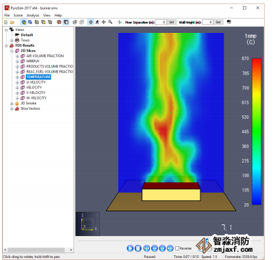 2. FDS 模擬對話框將出現并顯示模擬的進度。 默認情況下,PyroSim 指定的結束時間為 10 秒。 模擬完成后,PyroSim Results 將啟動并顯示模型的 3D 靜止圖像。
