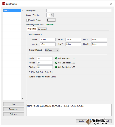在本例中,我們將使用0.1 m寬的網格單元。該值略小于500 kW火災特征直徑(D*)的1/5。根據經驗法則,建議的單元尺寸范圍為D*的1/5到1/20,以確保在羽流建模中至少具有中等水平的準確性(McGrattan,Kevin,et al.2014)。使用較小的網格單元(因子為2)將使誤差減少因子為4,但將使模擬運行時間增加因子為16。
