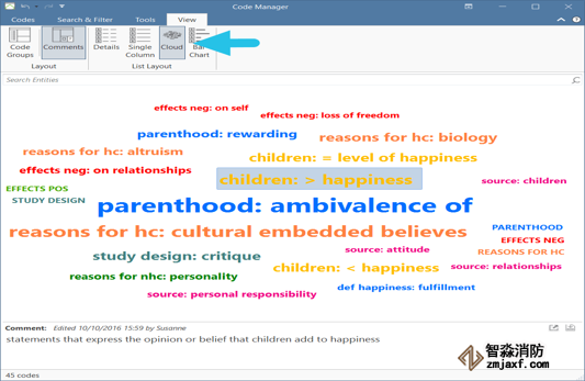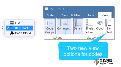 云視圖和條形圖視圖中的代碼與列表視圖中的代碼具有相同的上下文菜單。因此,您可以按照從列表視圖中使用的相同方式處理代碼,即合并、拆分或重命名代碼、編寫注釋、創(chuàng)建智能代碼等。您可以通過代碼訪問新的視圖選項Windows版本中的Manager View選項卡,以及Mac版本中的工具欄: