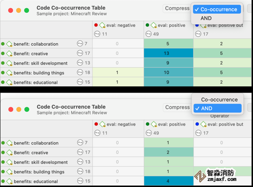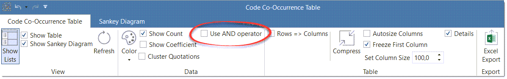 您現(xiàn)在可以在代碼共現(xiàn)表中的共現(xiàn)和AND運算符直接切換。這允許您僅搜索編碼完全相同引用的代碼: