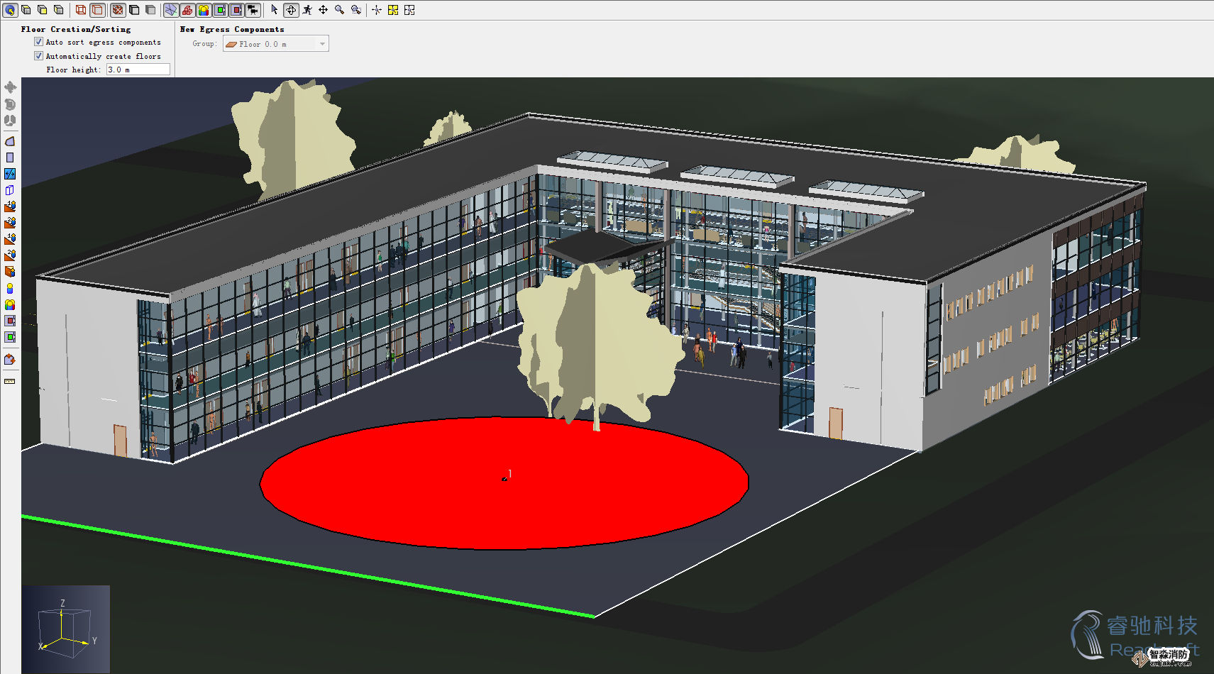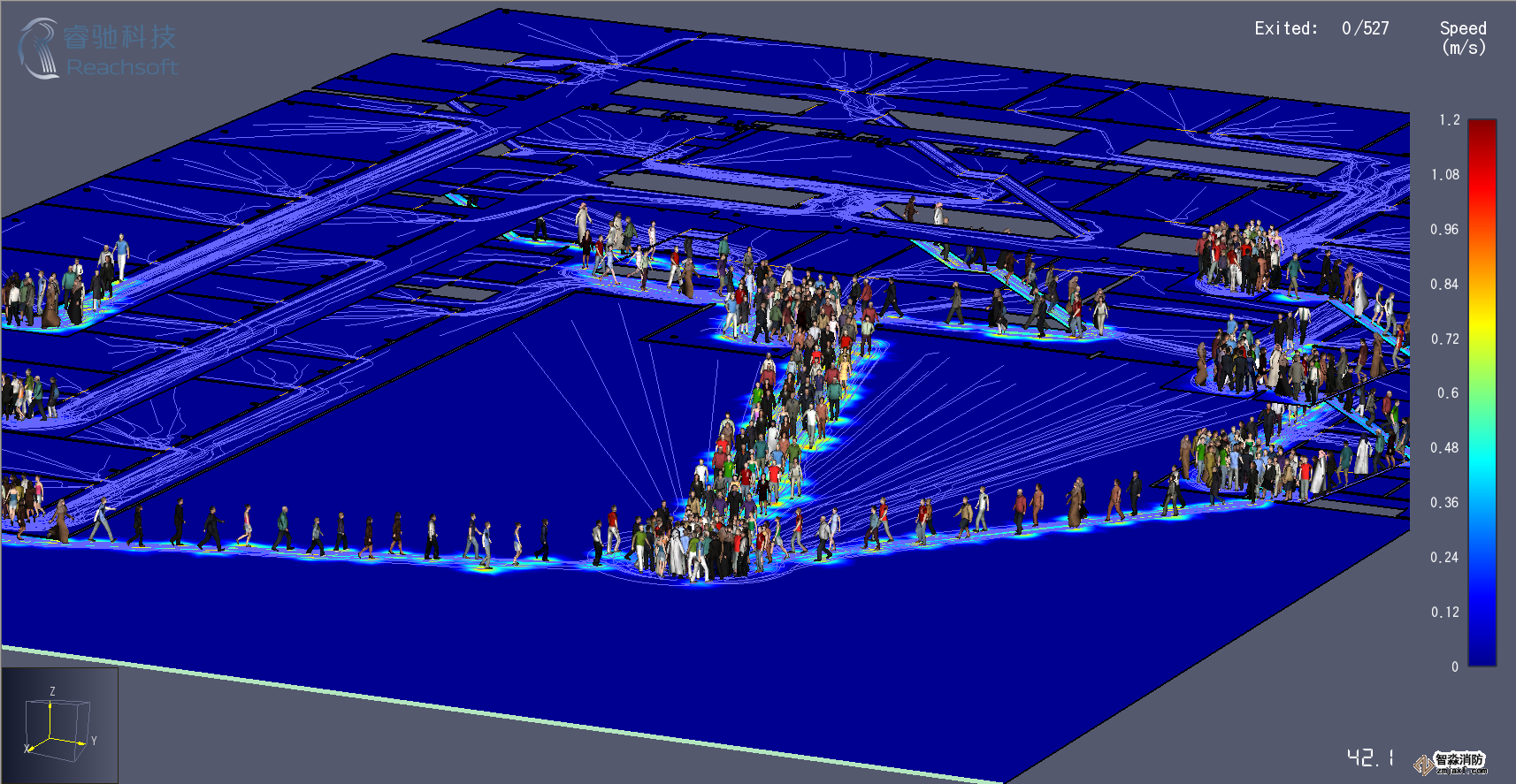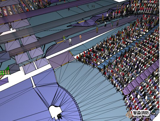 -Pathfinder還提供了高性能可視化的3D時(shí)間歷程模擬,利用透明化功能來(lái)更好地顯示密集人群在樓層中的疏散情況。