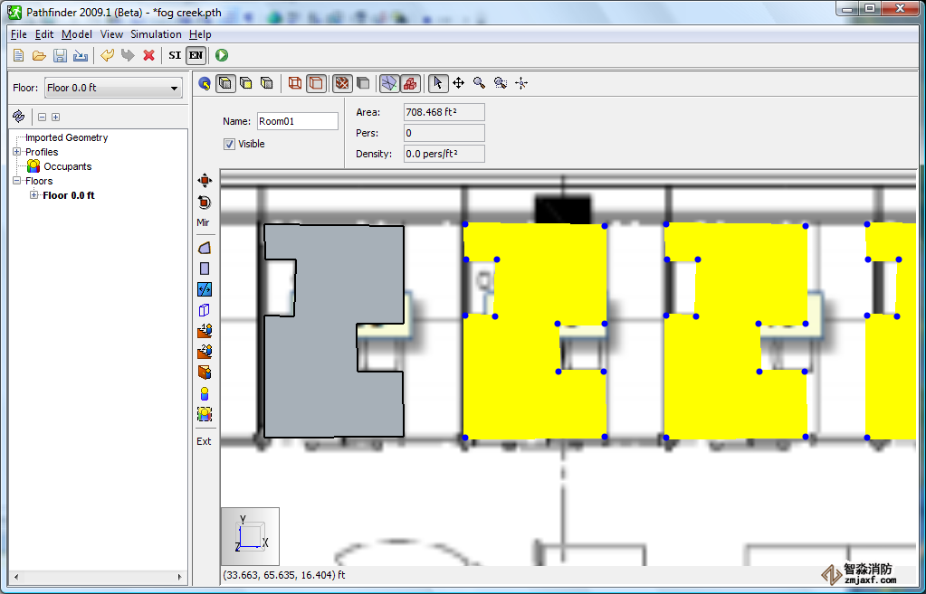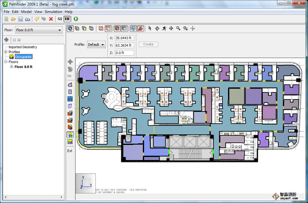 以下示例演示了如何導(dǎo)入jpg格式的藍(lán)圖,然后通過在藍(lán)圖上進(jìn)行草圖繪制來創(chuàng)建Pathfinder疏散模型。