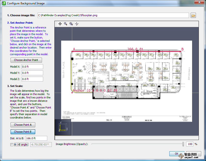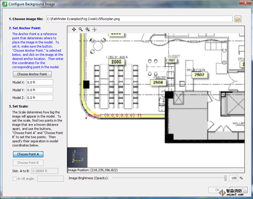 - 我們首先為圖像定義“錨點(diǎn)”。輸入坐標(biāo)型號(hào)X: 0.0 ft,型號(hào)Y: 0.0 ft和Z型: 0.0 ft。單擊選擇錨點(diǎn)按鈕,然后單擊圖像左下方的標(biāo)記。