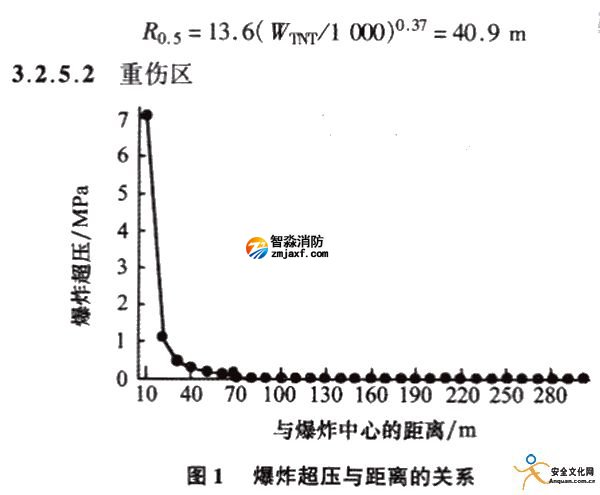 該區的人員如缺少防護.則被認為將無例外地蒙受嚴重傷害,極少數人可能死亡或受輕傷。其內徑為R0.5,外徑R1(m),△P為引起人員輕傷沖擊波峰值,其值為44